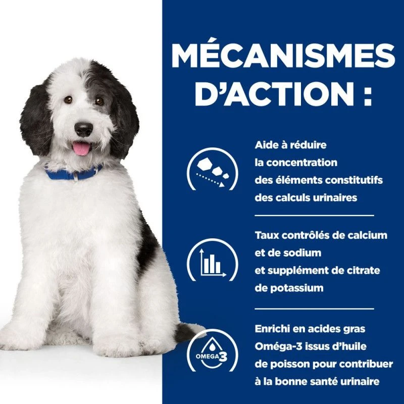 Cet aliment est destiné à la prise en charge nutritionnelle des problèmes urinaires chez le chien adulte et sénior. Veuillez consulter votre vétérinaire avant utilisation.