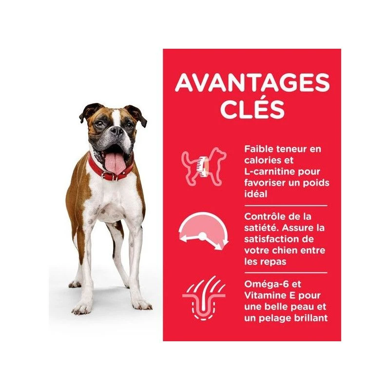 – 40% de matière grasse et – 18% de calories (comparé aux croquettes Hill’s Canine Adult medium).