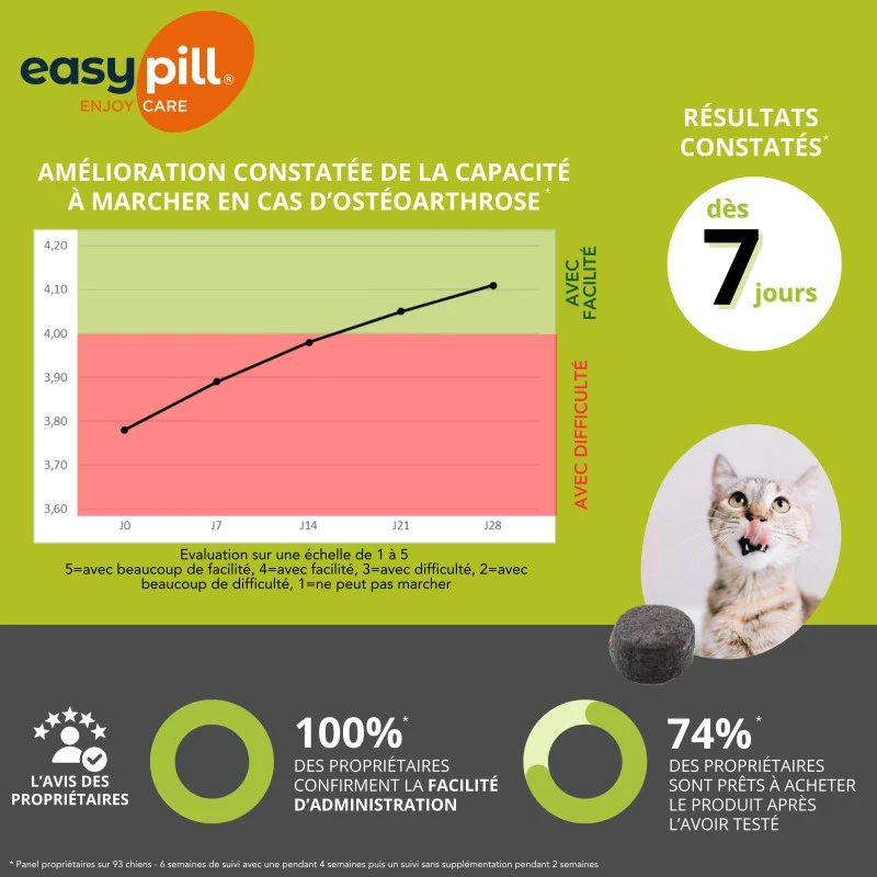 Easypill® Renaflex pour chat a Ă©tĂ© spĂ©cialement formulĂ© pour soutenir les articulations en cas d’ostĂ©oarthrose lorsqu’il est nĂ©cessaire de soutenir simultanĂ©ment la fonction rĂ©nale. Il favorise le confort articulaire en soutenant la qualitĂ© des articulations et en amĂ©liorant l’activitĂ© de l’animal grâce Ă l’action conjointe des peptides bioactifs issus du collagène hydrolisĂ© de poisson et des omĂ©ga-3 (DHA). Il contribue Ă©galement Ă soutenir le fonctionnement rĂ©nal en apportant du carbonate de calcium qui complexe le phosphore. Le produit fournit un apport de L-carnitine. Des rĂ©sultats ont Ă©tĂ© constatĂ©s dès 7 jours sur la mobilitĂ© et les vocalises liĂ©es Ă la douleur1. Grâce Ă son format en bouchĂ©es appĂ©tentes, Easypill® Renaflex pour chat est facile Ă donner avec jusqu’à 95% de prise spontanĂ©e2. Chaque boulette est formulĂ©e pour apporter les quantitĂ©s de nutriments nĂ©cessaires en une seule bouchĂ©e par jour.