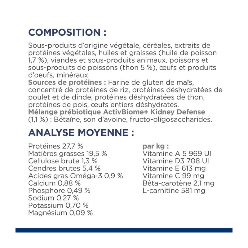 Les croquettes K/D Kidney au thon sont destinées à la prise en charge nutritionnelle des problèmes cardiaques et rénaux chez le chat. Veuillez consulter votre vétérinaire avant utilisation.