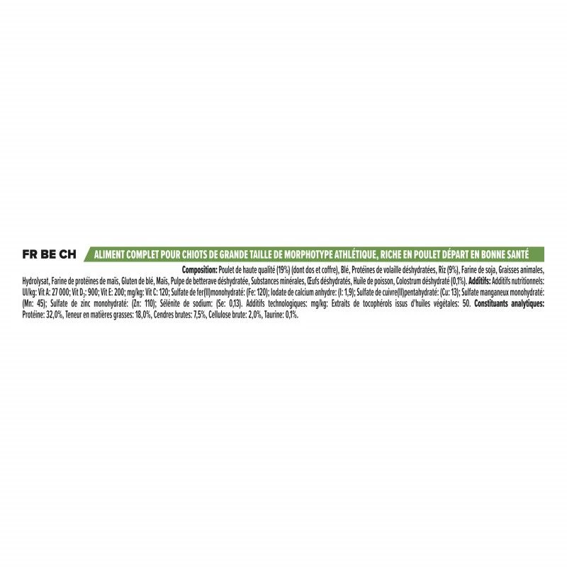 - Cette formule est spécialement adaptée aux chiots athlétiques de grande taille pour soutenir leur niveau d’activité et leur développement musculaire.
