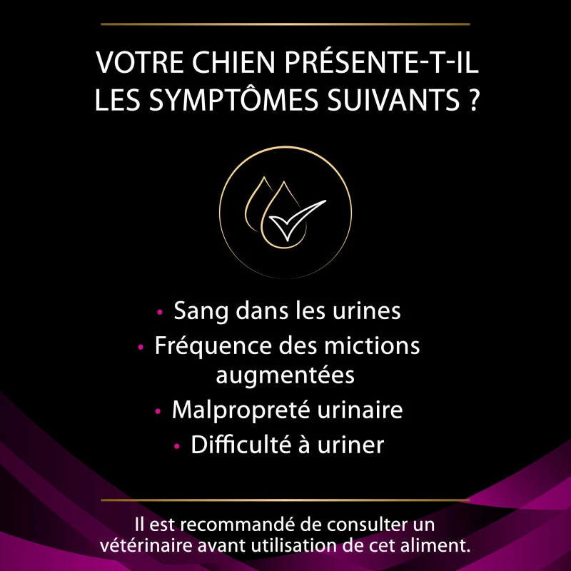 Les croquettes Pro Plan Veterinary Diets sont destinées aux chiens ayant des problèmes urinaires. Veuillez consulter votre vétérinaire avant utilisation.