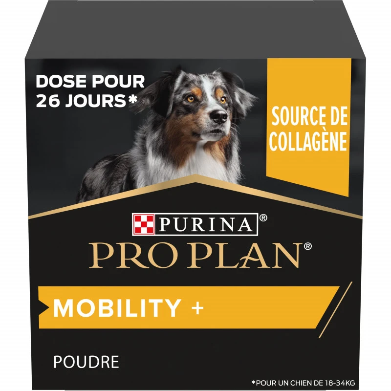 Purina PRO PLAN® a mis au point une gamme d’aliments complémentaires ciblés destinés à agir sur la mobilité, l’immunité, la vitalité, la digestion, la peau & le pelage et le bien-être. PRO PLAN® Mobility+ soutient les articulations de votre chien, grâce à une formule concentrée contenant du collagène (issu de la membrane de l’œuf), de l’acide hyaluronique (purifié), des moules vertes et de la glucosamine.