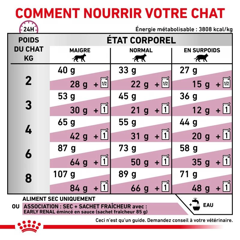 Le plus : Vous pouvez associer cet aliment avec les sachets repas Cat Early Renal de chez Royal Canin pour profiter des bienfaits de la bi nutrition.