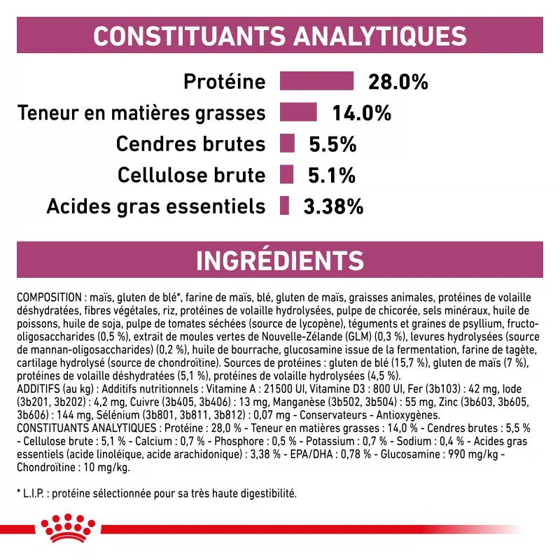 - Une formule hautement digestible grâce à une teneur équilibrée en fibres, incluant des prébiotiques, afin de favoriser une digestion et un transit sains.