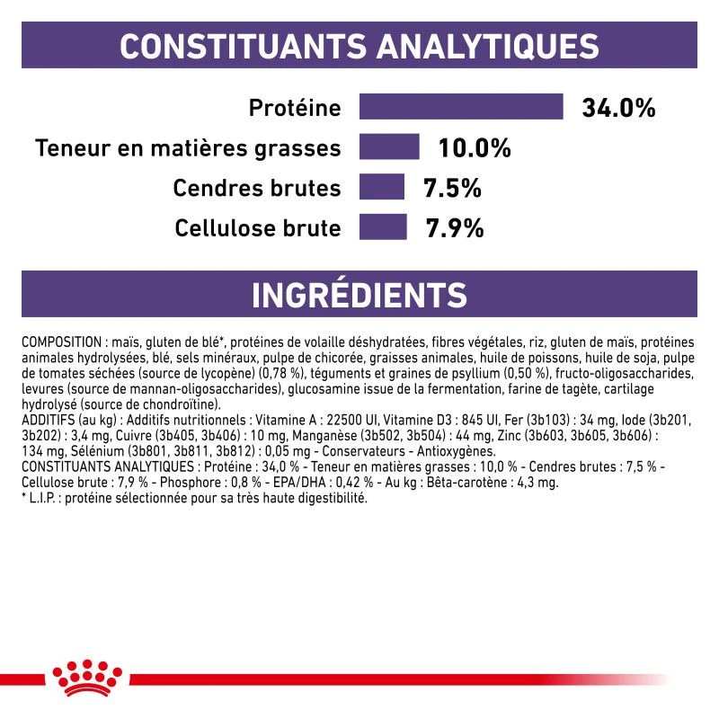 Pour combler l’appétit de votre félin avec une recette savoureuse, vous pouvez mixer ces croquettes avec les sachets repas Royal Canin Mature Consult Balance.