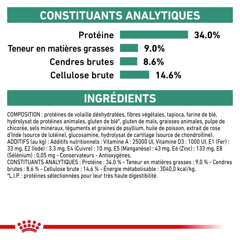 - Une formule enrichie en minéraux et vitamines pour compenser les effets de la restriction et assurer les apports adéquats.