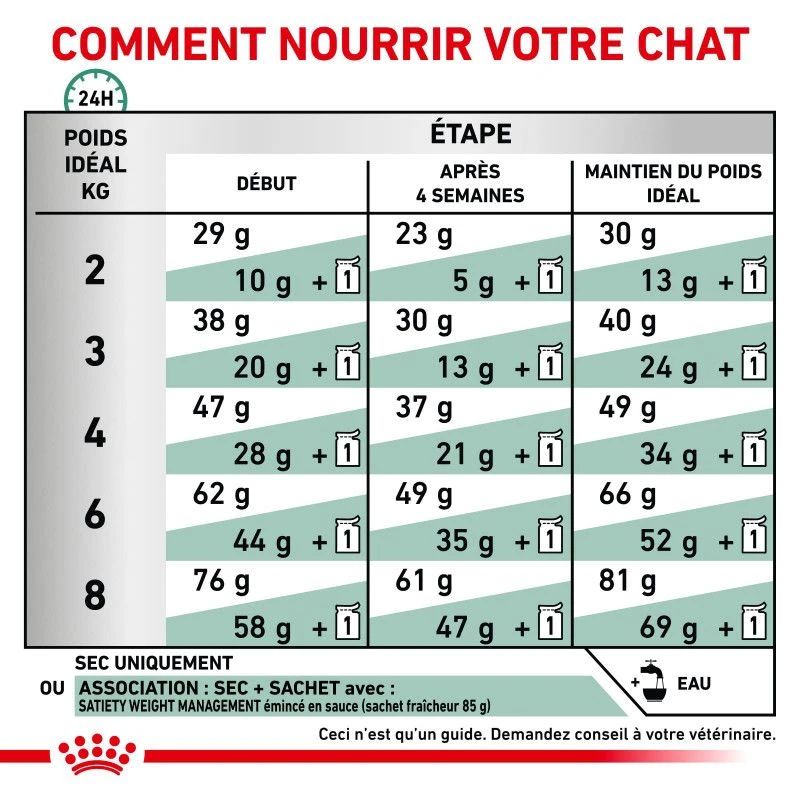 Les croquettes Royal Canin Cat Satiety Weight Management sont destinĂ©es Ă la prise en charge nutritionnelle des problèmes d’obĂ©sitĂ© chez le chat. Veuillez consulter votre vĂ©tĂ©rinaire avant utilisation. Â