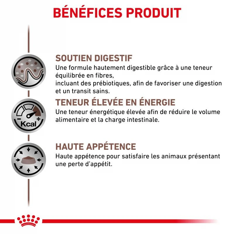 La boîte Dog Gastro Intestinal Royal Canin est destiné à la prise en charge nutritionnelle des problèmes digestifs chez le chien. Veuillez consulter votre vétérinaire avant utilisation.