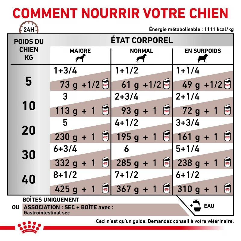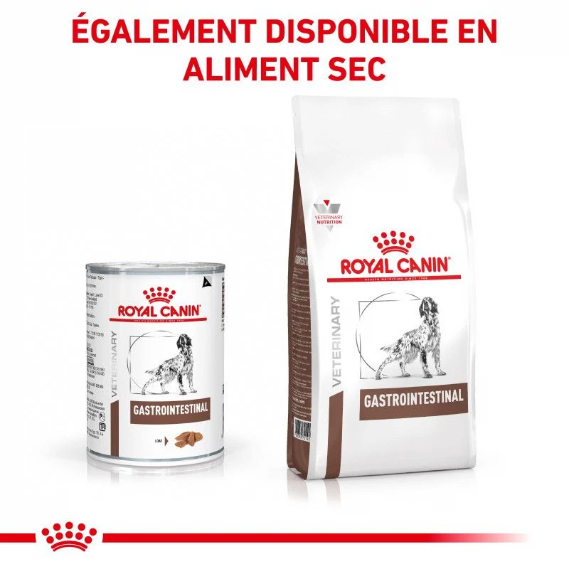 Le plus : Les boîtes Dog Gastrointestinal existe également en formule sèche avec les croquettes chiens Royal Canin Dog Gastrointestinal