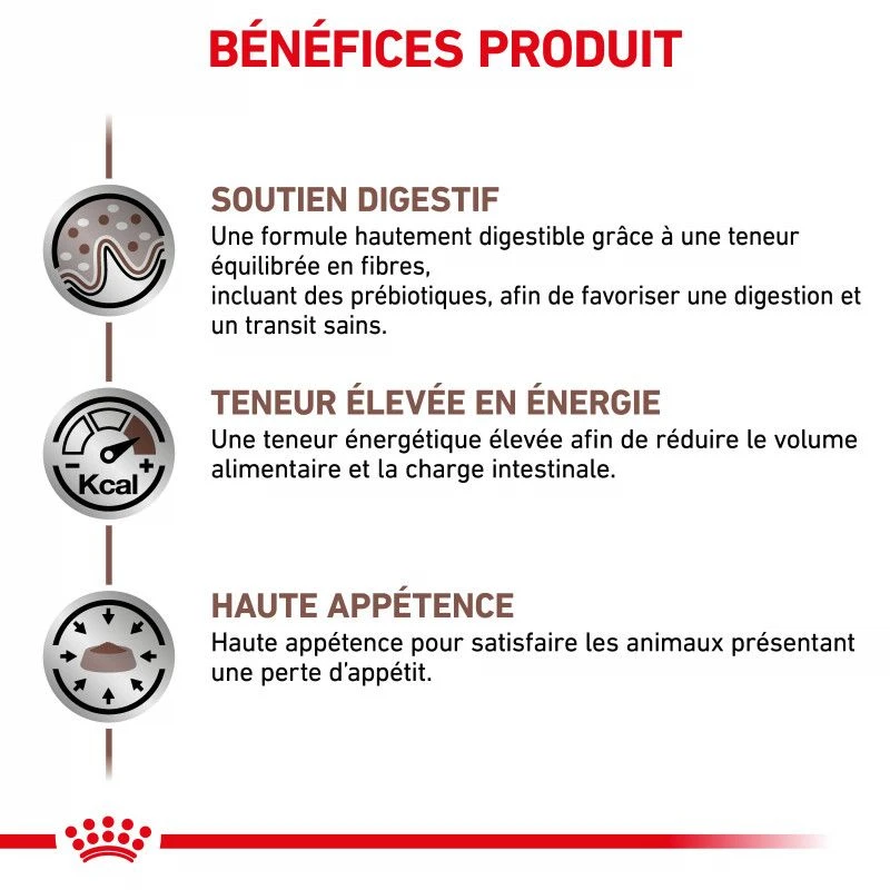 - Royal Canin Dog Gastro Intestinal favorise la reprise de poids lors de la convalescence.