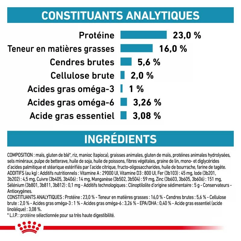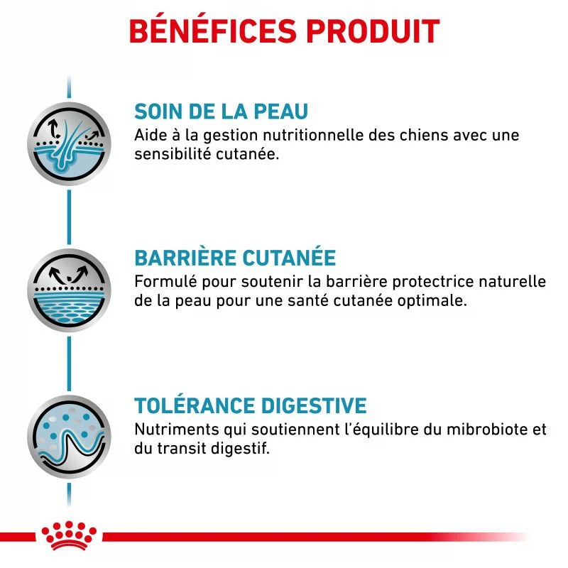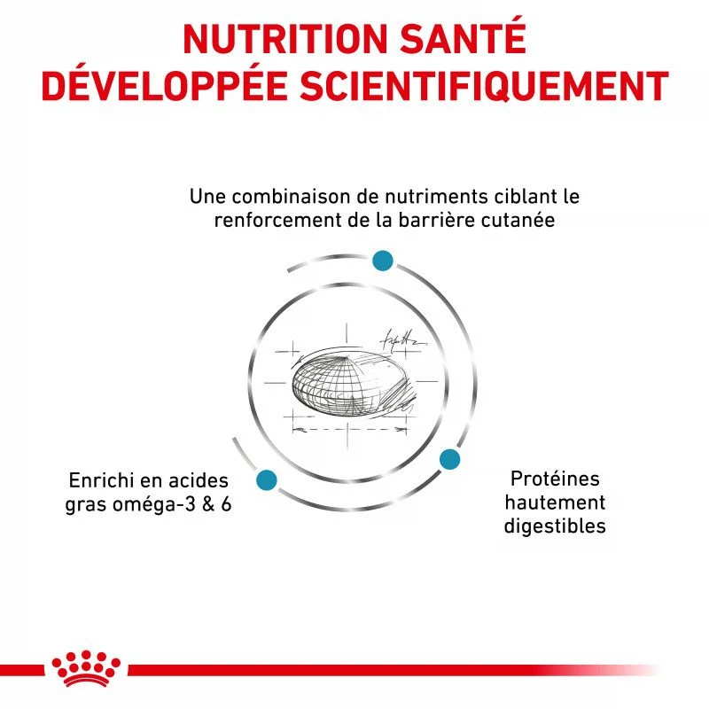 Les croquettes Royal Canin Dog Skin Care Adult sont destinées à la prise en charge nutritionnelle des problèmes de peau et pelage chez le chien. Veuillez consulter votre vétérinaire avant utilisation.