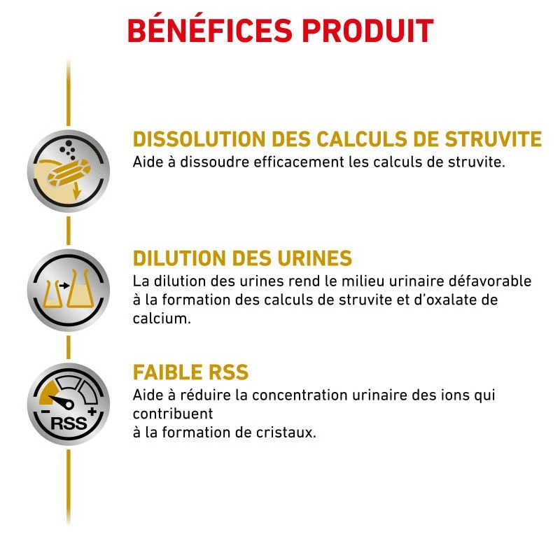 Cette alimentation diététique humide est destinée à la dissolution des calculs de struvite et à la réduction de la formation récidivante de calculs de struvite