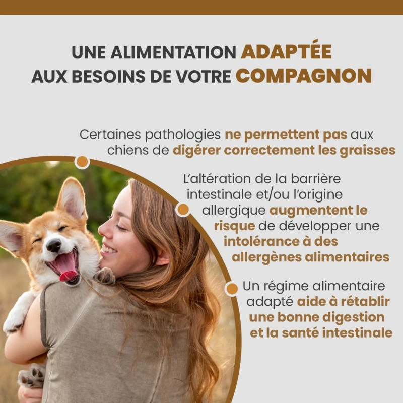 Cet aliment est destiné à la prise en charge des troubles digestifs chez les chiens qui nécessitent un régime pauvre en matières grasses. Veuillez consulter votre vétérinaire avant utilisation.