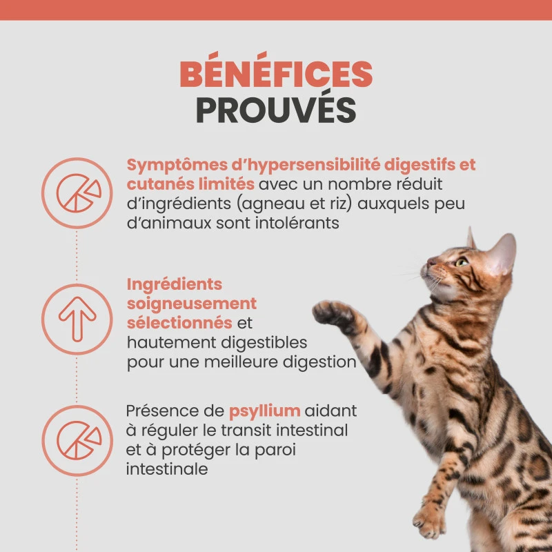 Cet aliment est destiné à la prise en charge nutritionnelle des allergies alimentaires et cutanées ainsi que des problèmes digestifs chez le chat. Veuillez consulter votre vétérinaire avant utilisation.
